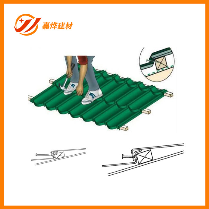 1、將彩石金屬瓦固定在掛瓦條上,固定方式為金屬釘水平釘設(shè)(見(jiàn)附圖)要求每片瓦不少于5顆,固定牢固,伸入掛瓦條不小于20mm。